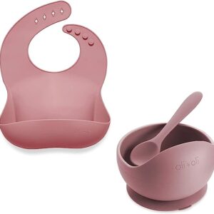 Ali+Oli Bundle | Silicone Suction Bowl & Spoon (Mauve) with Waterproof Silicone Bib (Mauve) for Baby & Toddler