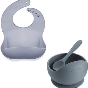 Ali+Oli Bundle | Silicone Suction Bowl & Spoon (Iron) with Waterproof Silicone Bib (Pebble) for Baby and Toddler