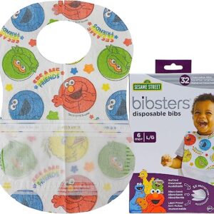 Bibsters Sesame Street Large Disposable Bibs with Patented Crumb-Catcher, Leakproof Liner, and Reusable Fastener -Age 6 Months and Up