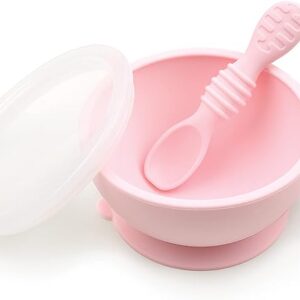 Bumkins Suction Silicone Baby Feeding Set, Bowl, Lid, Spoon, BPA-Free, First Feeding, Baby Led Weaning – Pink
