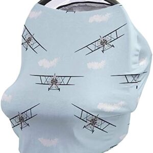 Car Seat Canopy Nursy Cover Airplane, Multi Use Breastfeeding Scarf for Infant Carseat Canopy Stroller Shopping Cart Highchair Old Aircraft Biplanes in Blue Sky Speedy Propellers Wings Retro Design