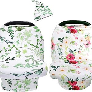 Carseat Cover for Babies, 2Pack Infant Car seat Canopy for Boys Girls, Floral & Green Leaf Breastfeeding Nursing Cover, Breathable Stretchy, Multi-use Cover for Stroller High Chair Shopping Cart