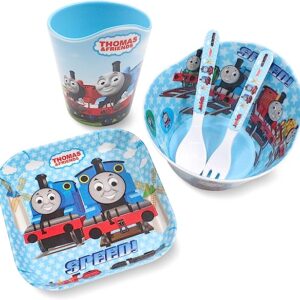 Finex Thomas the Train 5 Pcs Set Children Cartoon Durable Tableware Meal Dishes Mealtime Food Feeding Eating Set includes Dinner Serving Bowl Plate Cup with a Matching Spoon and Fork for Kids