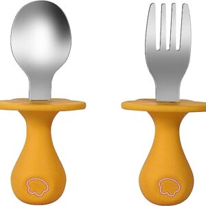 Infant Self Baby Spoon Fork Set Toddler Silicone Utensils Stainless Steel Tableware First Training Weaning for 6+ Month (Yellow)