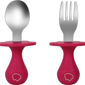 Infant Self Baby Spoon Fork Set Toddler Silicone Utensils Stainless Steel Tableware First Training Weaning for 6+ Month (Rose red)