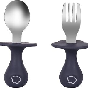Infant Self Baby Spoon Fork Set Toddler Silicone Utensils Stainless Steel Tableware First Training Weaning for 6+ Month (Grey)