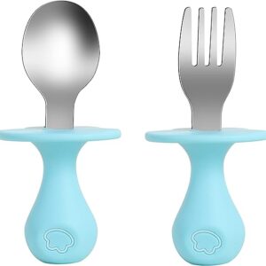 Infant Self Baby Spoon Fork Set Toddler Silicone Utensils Stainless Steel Tableware First Training Weaning for 6+ Month (Blue)