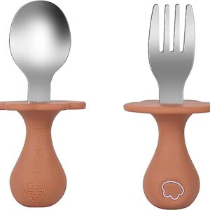 Infant Self Baby Spoon Fork Set Toddler Silicone Utensils Stainless Steel Tableware First Training Weaning for 6+ Month (Brown)