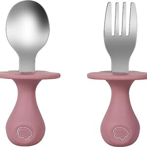 Infant Self Baby Spoon Fork Set Toddler Silicone Utensils Stainless Steel Tableware First Training Weaning for 6+ Month (Pink)