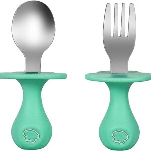 Infant Self Baby Spoon Fork Set Toddler Silicone Utensils Stainless Steel Tableware First Training Weaning for 6+ Month (Green)