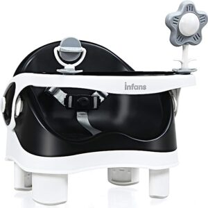 INFANS 3-in-1 Baby Booster Seat | Portable Floor, Feeding, and Booster Chair with Detachable Double Trays, Removable Toy, Safety Harness, Adjustable Heights, Portable Washable Dining Chair (Black)