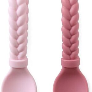 Itzy Ritzy Silicone Spoon & Fork Set; Baby Utensil Set Features A Fork and Spoon with Looped, Braided Handles; Made of 100% Food Grade Silicone & BPA-Free; Ages 6 Months and Up, Pink