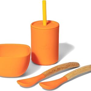 Avanchy Silicone La Petite Essential Collections Gift Set Orange – Includes Mini Silicone Bowl, Silicone Cup, and Bamboo Baby and Infant Spoons – Baby Dishes Set – Baby Shower Gifts