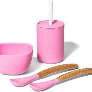 Avanchy Silicone La Petite Essential Collections Gift Set Pink – Includes Mini Silicone Bowl, Silicone Cup, and Bamboo Baby and Infant Spoons – Baby Dishes Set – Baby Shower Gifts