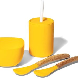 Avanchy Silicone La Petite Essential Collections Gift Set Yellow – Includes Mini Silicone Bowl, Silicone Cup, and Bamboo Baby and Infant Spoons – Baby Dishes Set – Baby Shower Gifts