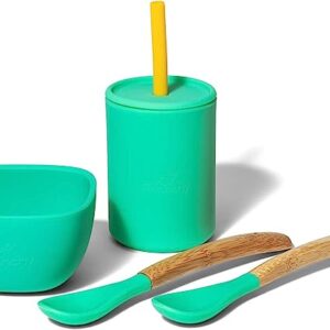 Avanchy Silicone La Petite Essential Collections Gift Set Green – Includes Mini Silicone Bowl, Silicone Cup, and Bamboo Baby and Infant Spoons – Baby Dishes Set – Baby Shower Gifts