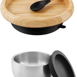 Avanchy Stainless Steel Silicon Suction Bowl with Lid & Bamboo Classic Baby Plate with Spoon