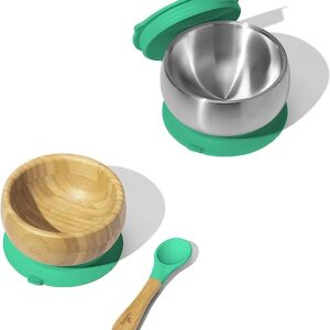 Avanchy Stainless Steel Bowl, Bamboo Suction Bowl & Baby Spoon – Stainless Steel Kids Bowls – Suction Bowls with Lids – Silicon Suction (Green)