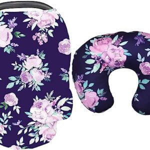 Nursing Pillow Cover & Carseat Cover Set, Purple Floral Breastfeeding Pillow Slipcover & Car Seat Canopies for Baby Boys & Girls, Nursing Pillow Case & Stroller Covers for Newborn, Soft Fabri
