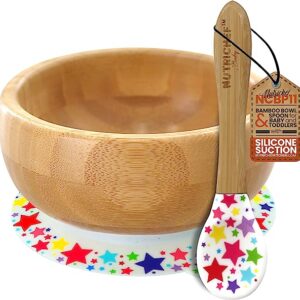 NutriChef Bamboo Baby Feeding Bowl – Wooden Infant Toddler Dish and Spoon Set w/ Silicone Suction Base for Stay Put Eating, BPA-Free, Hypoallergenic, For Children Aged 4-72 Months (Stars)