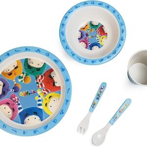 Oddbods Bamboo Fiber Dinnerware Set for Kids, Eco-Friendly Plate, Bowl, Cup, Fork and Spoon, 5 Piece Children’s Dining Set with Dishes and Utensils, Non-Toxic, BPA Free