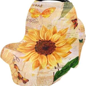 Vintage Yellow Sunflower and Butterfly Baby Car Seat Covers, Nursing Cover Breastfeeding Scarf Soft Breathable Stretchy Coverage, Infant Stroller Cover for Boys Girls