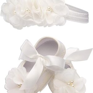 “Petals” White Lace Baptism Christening Shoe and Headband Set for Baby Girl (Size 1)