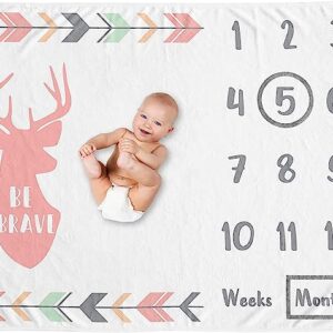 Sweet Jojo Designs Woodland Deer Girl Milestone Blanket Monthly Newborn First Year Growth Mat Baby Shower Memory Keepsake Gift Picture – Coral Pink Mint Green and Grey Woodsy Arrow Forest Animal Brave