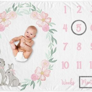 Sweet Jojo Designs Woodland Bunny Girl Milestone Blanket Monthly Newborn First Year Growth Mat Baby Shower Memory Keepsake Gift Picture – Blush Pink Mint Green Grey Boho Floral Watercolor Rose Flower