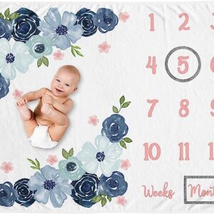 Sweet Jojo Designs Watercolor Floral Girl Milestone Blanket Monthly Newborn First Year Growth Mat Baby Shower Memory Keepsake Gift Picture – Navy Blue and Blush Pink Boho Shabby Chic Rose Flower