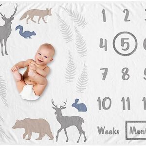 Sweet Jojo Designs Woodland Animals Boy Girl Milestone Blanket Monthly Newborn First Year Growth Mat Baby Shower Memory Keepsake Gift Picture – Blue Grey Tan Forest Bear Deer Fox Bunny Gender Neutral