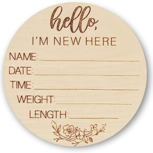 Wooden Newborn Welcome Sign – Hello I?m New Here Baby Name Sign – Round Baby Announcement Sign for Hospitals – Infant Arrival Stat Sign – 3.5 Inches Long & Wide with 3mm Thickness