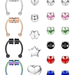 TEN MIRO 21Pcs Magnetic Septum Nose Ring Horseshoe Fake Nose Ring Hoop Stainless Steel Non Piercing Clip on CZ Earrings Magnetic Stud Earrings for Women Men