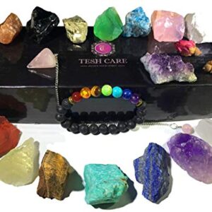TESH CARE Chakra Therapy Starter Collection 17 pcs Healing Crystals kit, 7 Raw Chakra Stones,7 Colorful Gemstones, Amethyst,Rose Quartz Pendulum,Chakra Lava Bracelet,Dry Roses,Guide,COA,Gift Ready