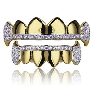 TOPGRILLZ 14K Gold Plated Iced Out CZ Top and Bottom Vampire Fangs Werewolf Grillz for Your Teeth Hip Hop Halloween Accessory