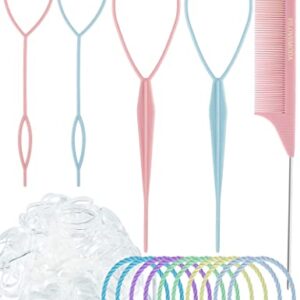 Topsy Hair Tail Tools,FILOVEMODA 1pcs Tail Braiding Combo, 4pcs French Braid Tool Loop For Hair Styling, 100pcs Clear Mini Elastic Hair Bands, 10pcs Ouchless Elastic Hair Ties (pink)