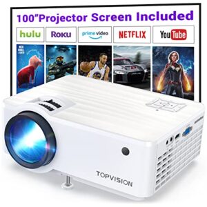 TOPVISION Projector, 7500L Portable Mini Projector with 100” Projector Screen, 1080P Supported, Built-in HI-FI Speakers, Home Theater Movie Projector Compatible with, HDMI,Fire Stick,VGA,USB,TF,AV,PS4