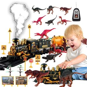 Train Set,YF-TOW Rc Train Toy for Boys Girls with 6pcs Dinosaur Toys,Smokes, Lights & Sound, Railway Kits,Steam Locomotive Engine, Cargo Cars & Tracks, Gifts for 3+ Year Old Kids (Morandi Green)