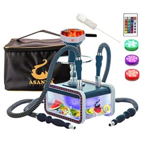 Travel Hookah Set 2 Hose, ASANMA Micro Cuboid Acrylic Hookah with 2 Hose,Travel bag,Clean Brush,Magical Remote LED Light,Silicone Hookah Bowl,Coal Tongs for Better Shisha Hookah Narguile Smoking