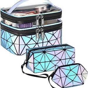 Travel Makeup Bag Set, MATEIN Luxury Luminous Geometric Cosmetic Bag for Women, High End Designer Holographic Makeup Bags Organizer Set, Double Layer Portable Multifunctional Toiletry Bags Set