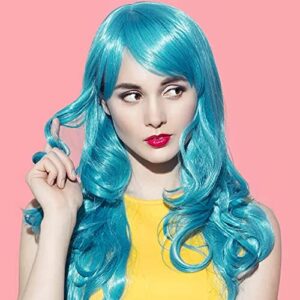 AISI QUEENS Blue Wigs with Bangs Long Wavy Wig for Women Synthetic Heat Resistant Hair Costume Cosplay Wig