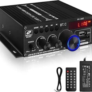 AK-380 USB SD BT.C FM AUX Audio Power Amplifier 400W+400W 2.0 CH HiFi Stereo AMP Speaker Bluetooth 5.0 Amp Receiver with 12V 5A Power Supply,Remote Control,FM Antenna for Car Home Bar Party