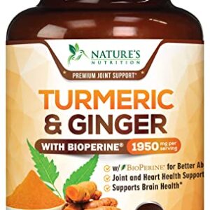 Turmeric Curcumin Ginger Bioperine 95% Curcuminoids 1950mg with Black Pepper for Best Absorption, Made in USA, Best Vegan Joint Support, Turmeric Supplement Pills by Natures Nutrition – 60 Capsules