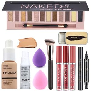 All in One Makeup Kit For Girls12 Colors Naked Eyeshadow Palette, Buff Beige For PHOERA Foundation Face Primer, Makeup Brush, Makeup Sponge, Eyebrow Soap Kit Brows Gel, Winged Eyeliner Stamp (SetB)