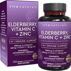 Viva Naturals Sambucus Elderberry with Vitamin C, Zinc, Vitamin D3 5000 IU & Ginger (120 Capsules) – Antioxidant & Immune Support Supplement, 2 Month Supply – 5 in 1 Black Elderberry for Adults