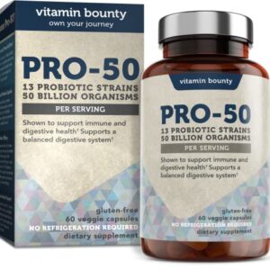 Vitamin Bounty Pro 50 Probiotics with 13 Probiotic Strains, Prebiotic Fermented Greens and Delayed Release Capsules, Probiotics for Women and Men, Digestive Health and Gut Health, 60 Capsules