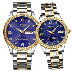 Watches for Couples Diamond Luxury Men and Women His and Hers Pair Watch Set Husband Wife Valentines Matching Wrist Watch Wedding Gifts Day Date Waterproof Quartz Analog NIBOSI