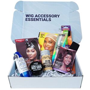 Wig Accessory Essentials Kit by WeSSENTIALS including 8 items Lace Front Dual Tip Adhesive, Wig Caps, Elastic Band, Edge Fixer, Edge Brush, Hair Shear Tool and Edge Scarf