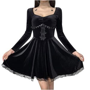 Women Gothic Dress Vintage Velvet Midi Dresses Womens Long Sleeve Lace Patchwork Punk Evening Party Dresse