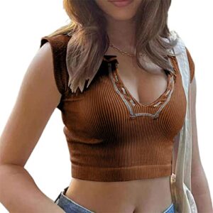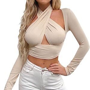 Women Halter Neck Crop Vest Top Long Sleeves Front Cutout Wrap Top Shirt Solid Color Buckle Top Medium Sleeve